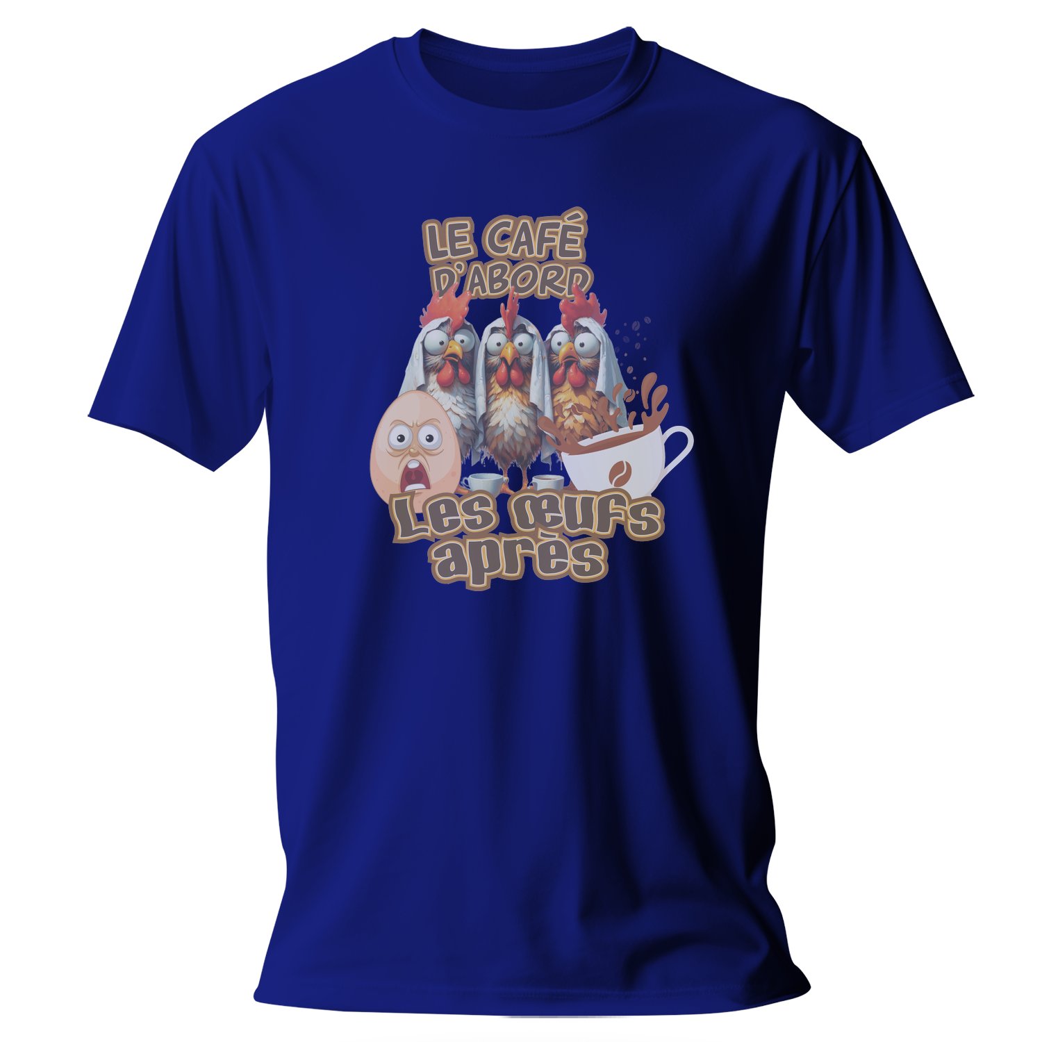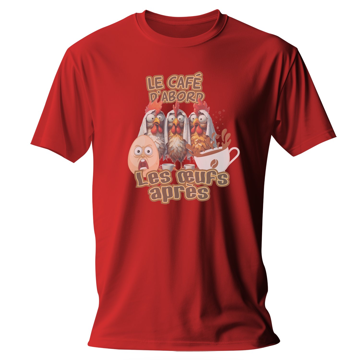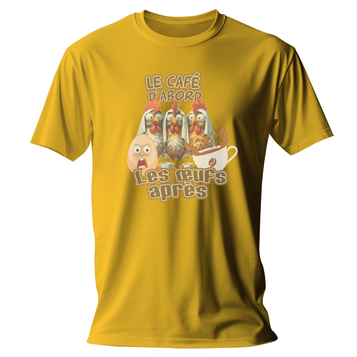 Embrace your love for coffee with this hilarious T-shirt featuring a whimsical design. Perfect for coffee enthusiasts, this shirt showcases a playful illustration of chickens, an egg, and the catchy phrase « LE CAFÉ D’ABORD, LES ŒUFS APRÈS », making it a fun conversation starter.