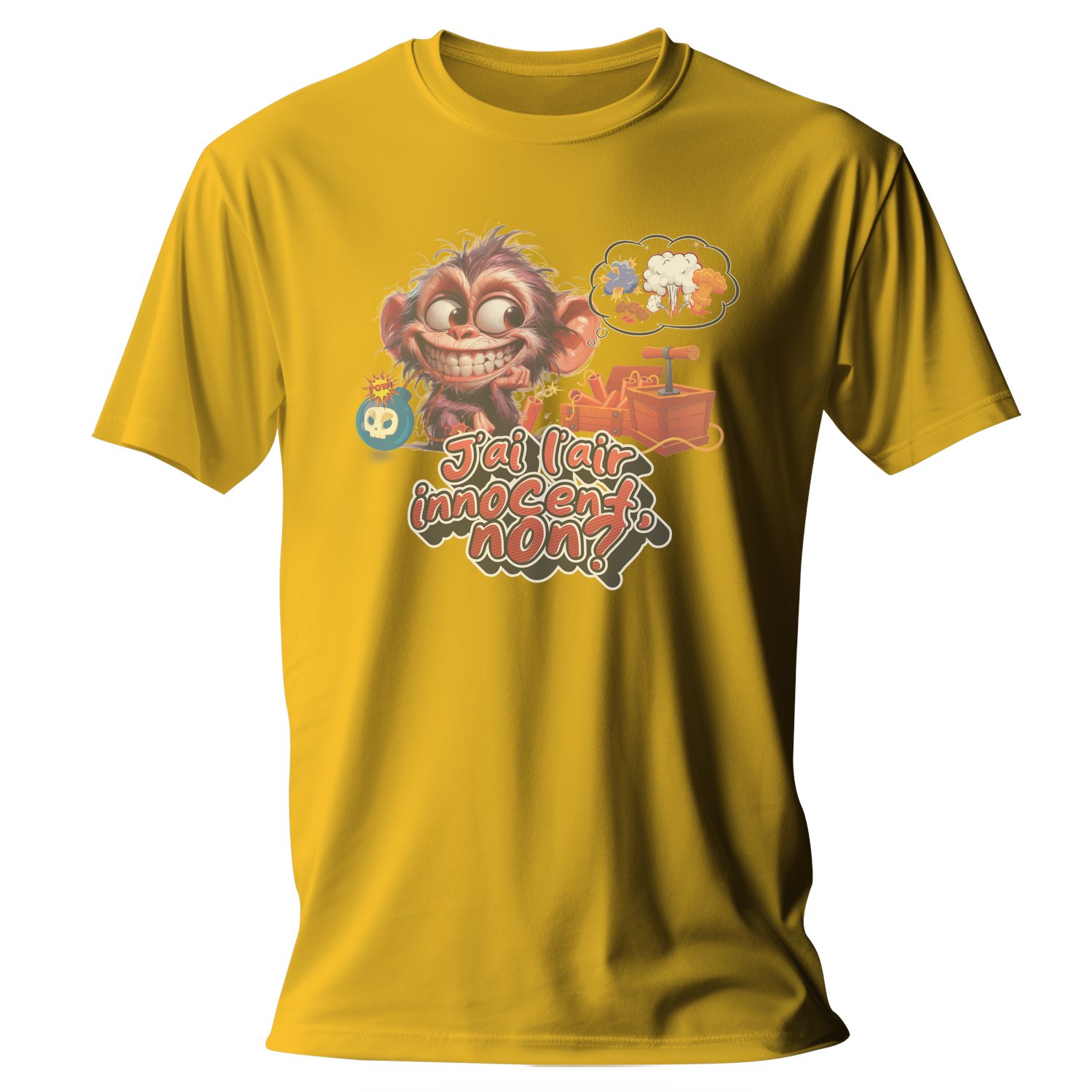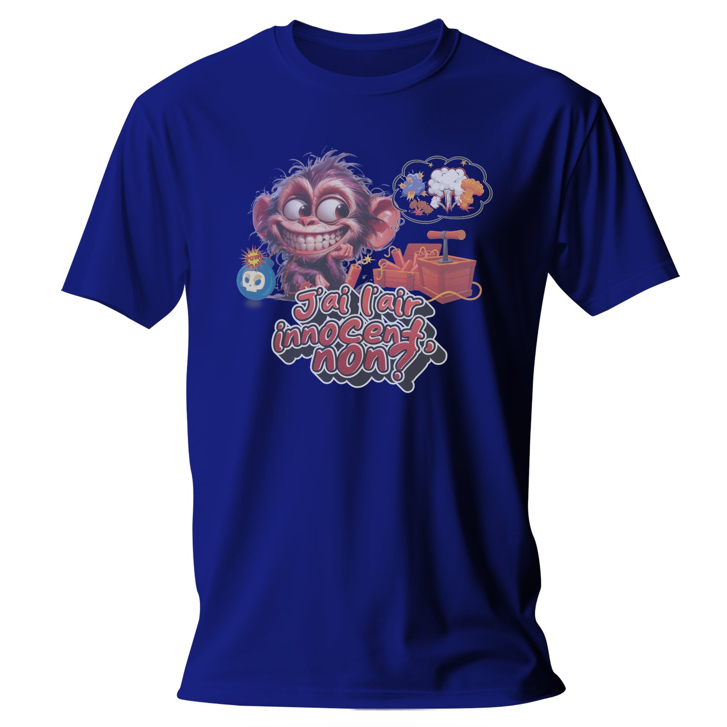 This playful T-shirt features a vibrant cartoon monkey with a mischievous grin, surrounded by fun elements like dynamite and explosions. The text « J’ai l’air innocent, non » adds a humorous touch, making it perfect for those who love to express their playful side.